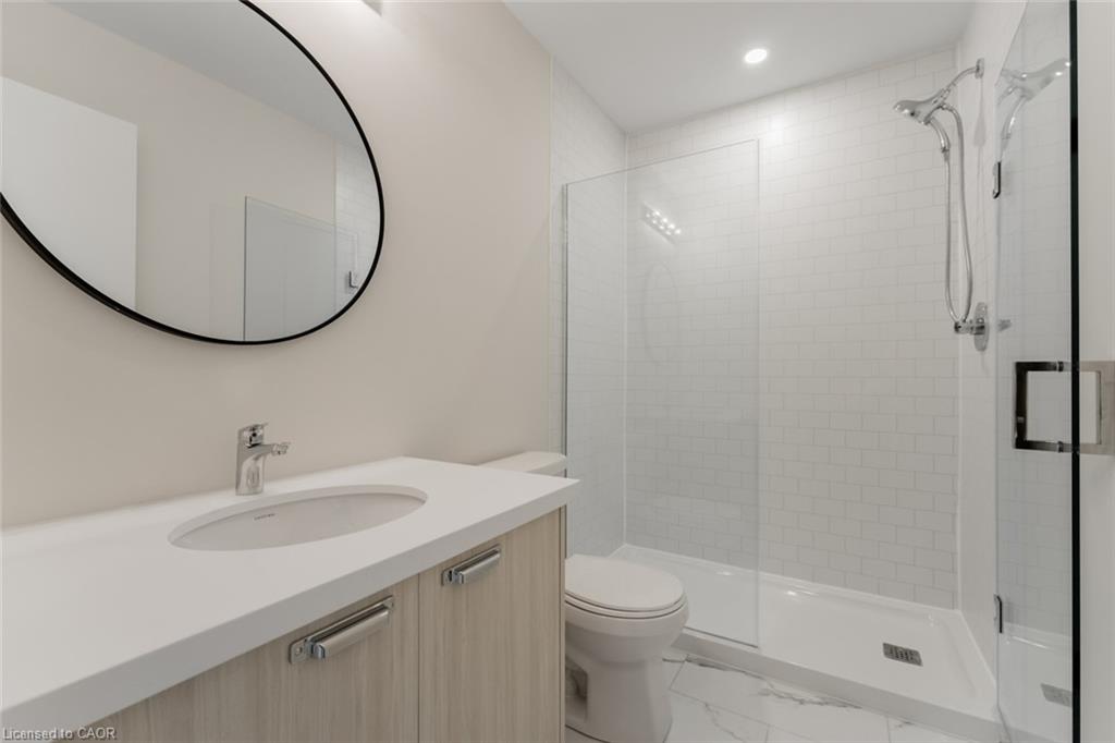 Large Closets, A Stylish Common 4 Pc Bath With Deep Tub, Glass Enclosure, And Quartz Counters, Along With Stacked Laundry And A Spacious
