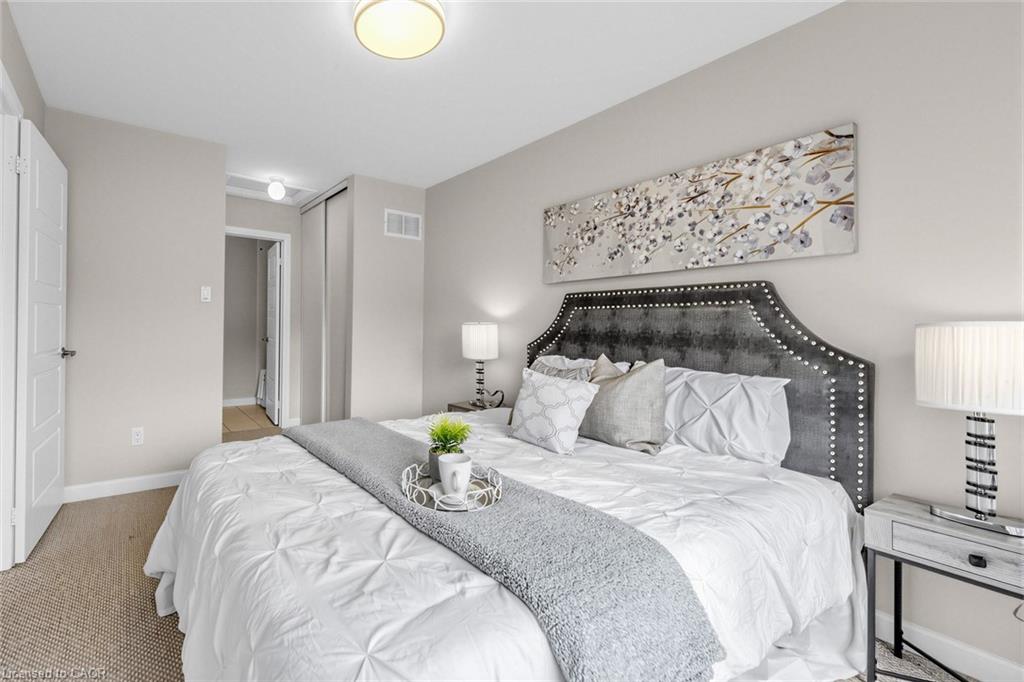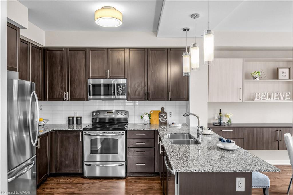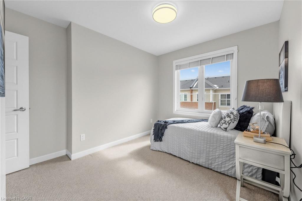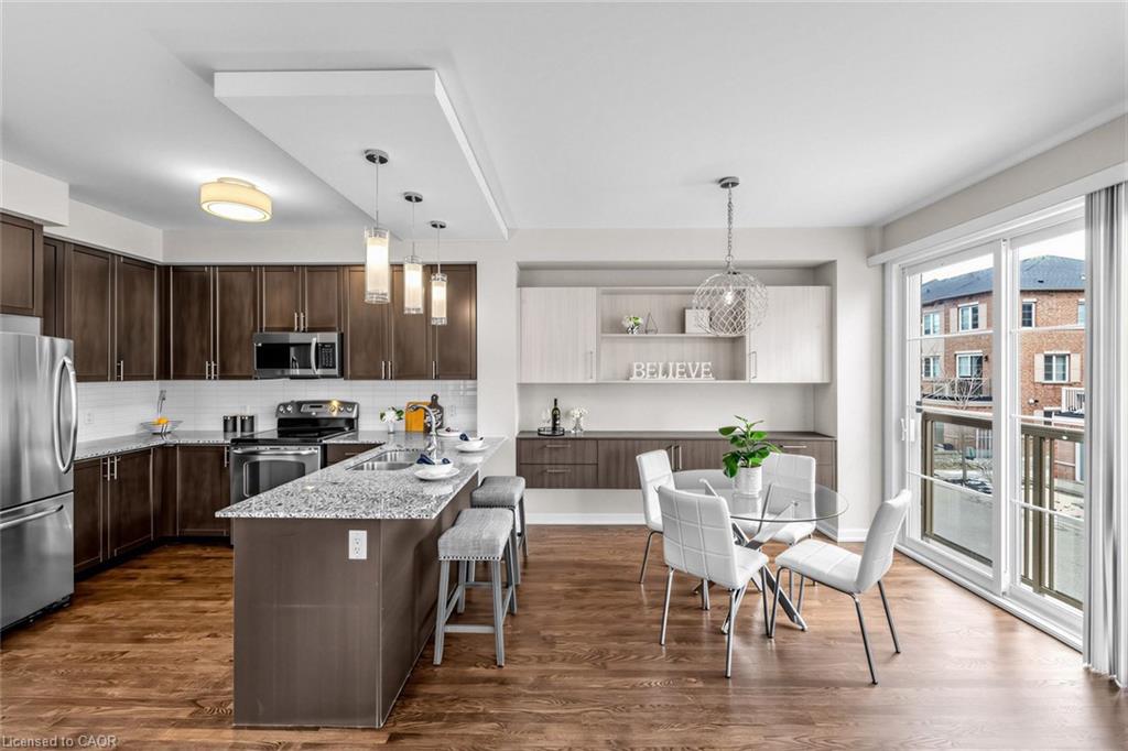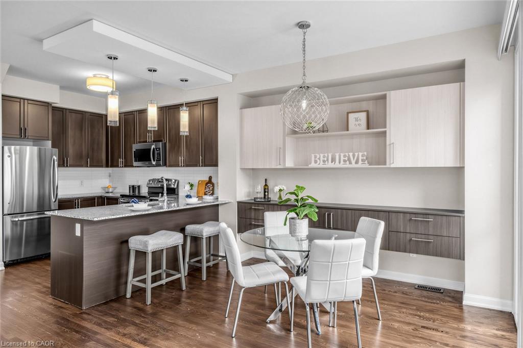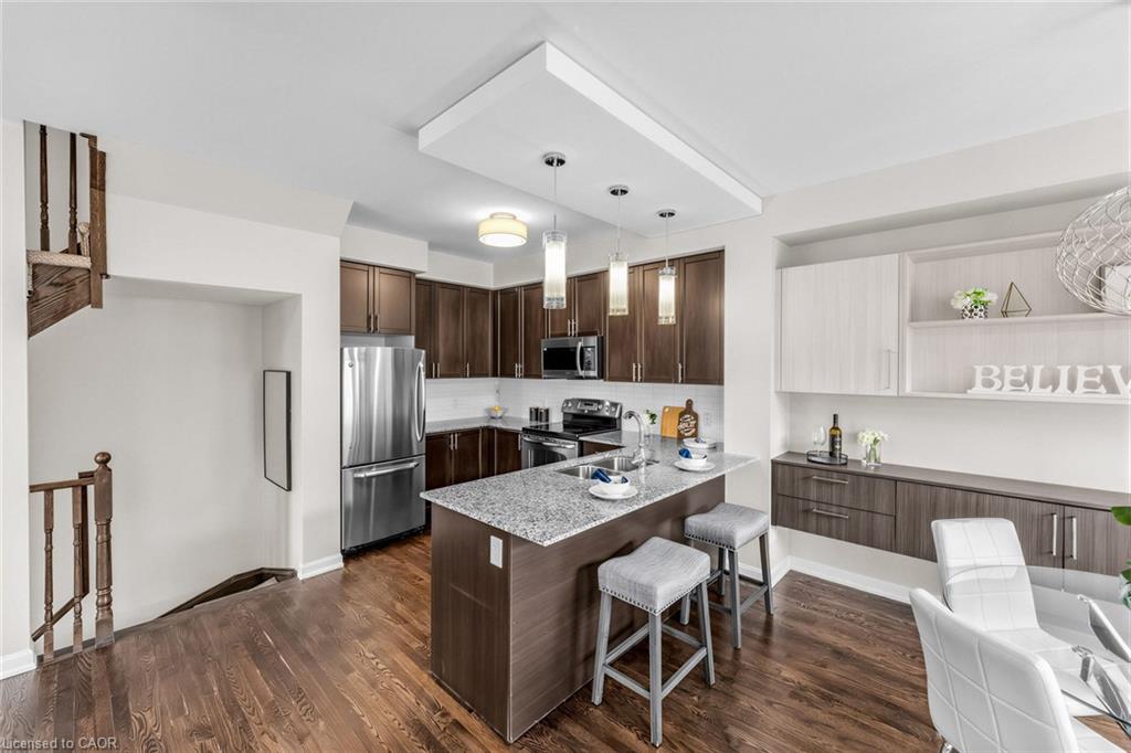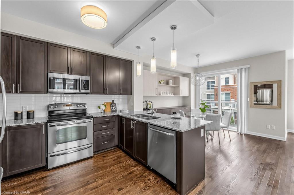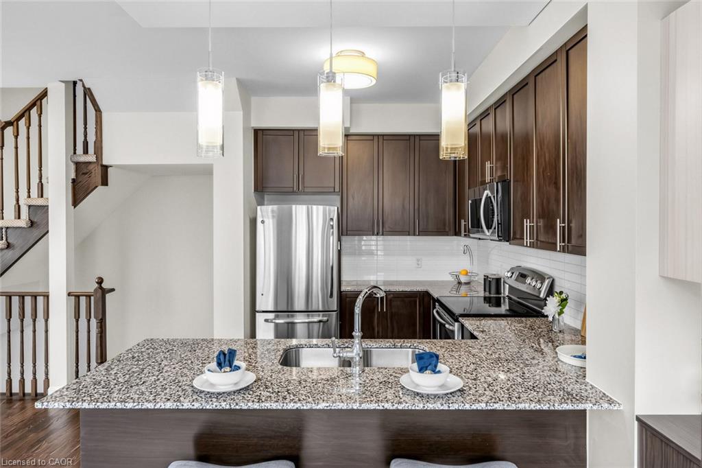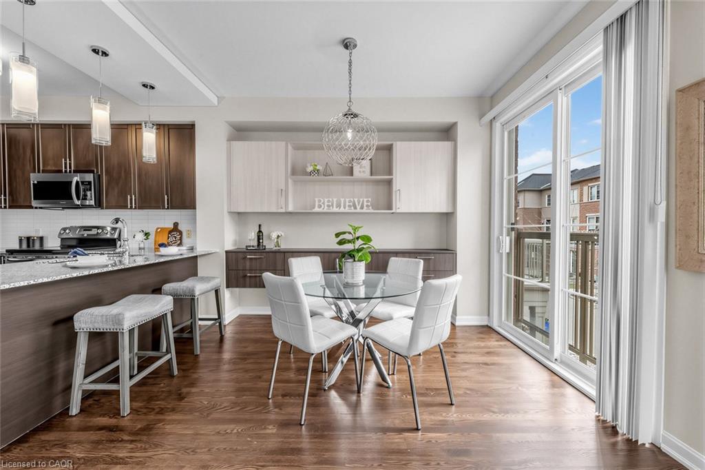 Welcome To 165 Hampshire Way #92, Milton - A Rare End-Unit Townhome That Lives Like A Semi. Nestled On A Premium Corner Lot This 3 Bedroom, 3 Bathroom Home Is Flooded With Natural Light From Multiple Exposures - A True Standout In The Complex. With Visitor Parking Conveniently Located Right Next Door, Everyday Living And Entertaining Are Seamless. Beautifully Updated And Completely Move-In Ready, Featuring Fresh Paint, Newly Refinished Hardwood Floors And Contemporary Light Fixtures Throughout. Offering Approximately 1,444 Sq Ft Of Functional, Well-Planned Living Space Designed For Both Comfortable Family Living And Effortless Entertaining. The Ground Level Welcomes You With A Bright Foyer Featuring A Coat Closet, Front-Load Laundry, Direct Garage Access And Additional Under-Stair Storage - Practical And Convenient For Daily Living. The Main Level Is The Heart Of The Home Featuring 9Ft Ceilings - Showcasing A Modern Kitchen With Stainless Steel Appliances, Granite Counters, Subway Tile Backsplash And Breakfast Bar Overlooking The Dining Area With Custom Built-In Cabinetry. The Space Flows Seamlessly Into A Spacious, Sun-Filled Living Room With Walkout To A Private Balcony - Perfect For Hosting Or Relaxing In An Open, Airy Setting. A Stylish Powder Room Completes This Level. The Upper Level Offers A Spacious Primary Retreat With Dual Closets And A 4-Piece Ensuite Featuring Quartz Counters And A Soaker Tub. Two Additional Generous Bedrooms And An Updated 3-Piece Bathroom With Glass Shower Provide Ideal Space For Family Or Guests. Includes 1 Garage And 1 Driveway Parking Space. Low Monthly POTL Fees Cover Snow Removal & Landscaping - Delivering True Low-Maintenance Living. Ideally Located Close To Top-Rated Schools, Parks, Trails, Shopping, Restaurants, Milton District Hospital, And With Quick Access To Hwy 401, 407 And Milton GO - Making This An Exceptional Opportunity For Families And Commuters Alike.